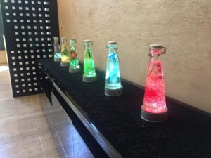 こちらは、一つ一つ回転しながらカラーが変化していく、ずって見ていたいような素敵な装飾でした。夕方からのパーティでは卓上の装飾へ。